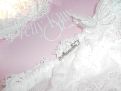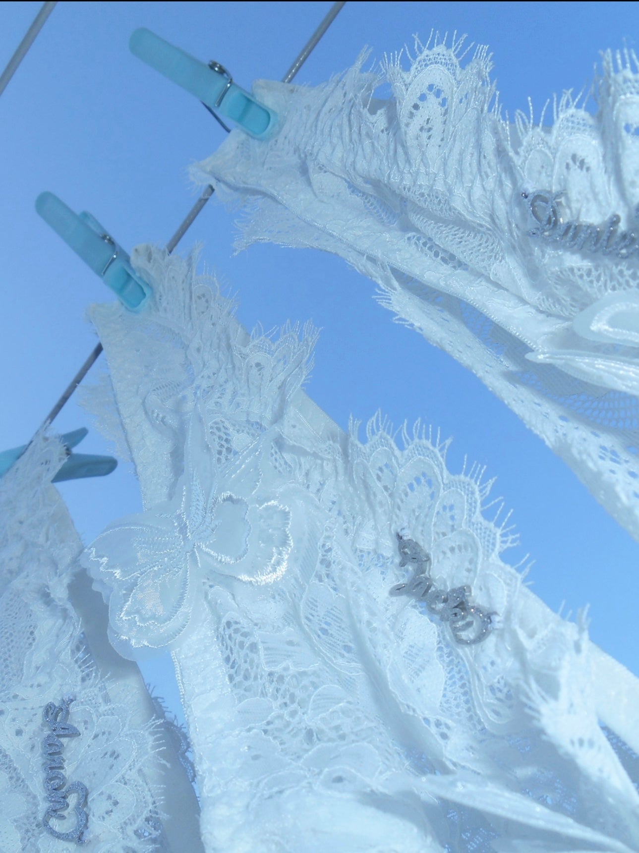 This set beautifully honours classic bridal lingerie traditions while adding our signature contemporary flair. We've kept all the timeless elements that make you feel effortlessly feminine - that stunning white lace, those soft silver accents - then elevated everything with the enchanting butterfly details.