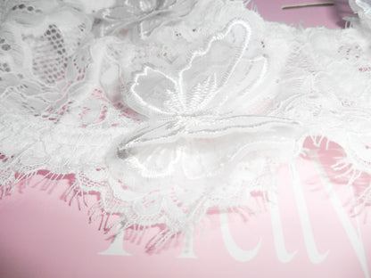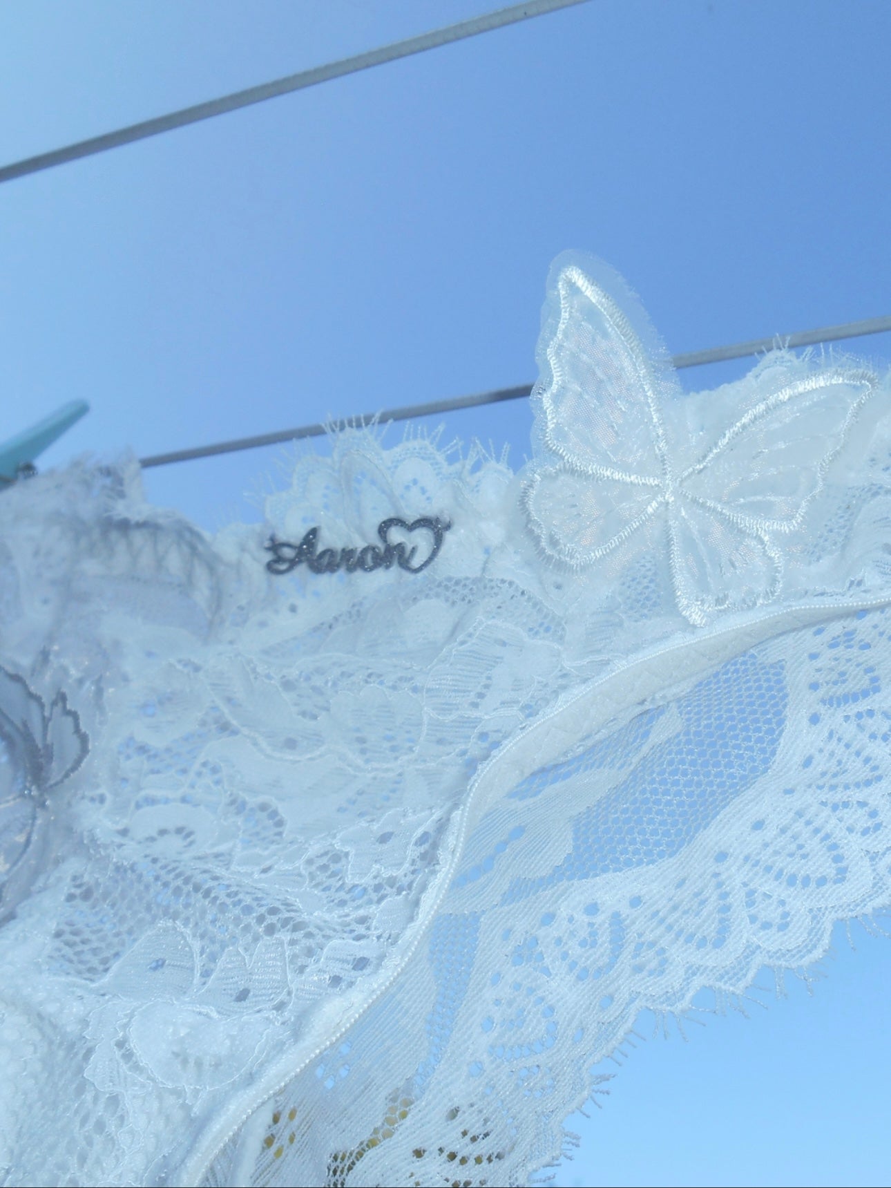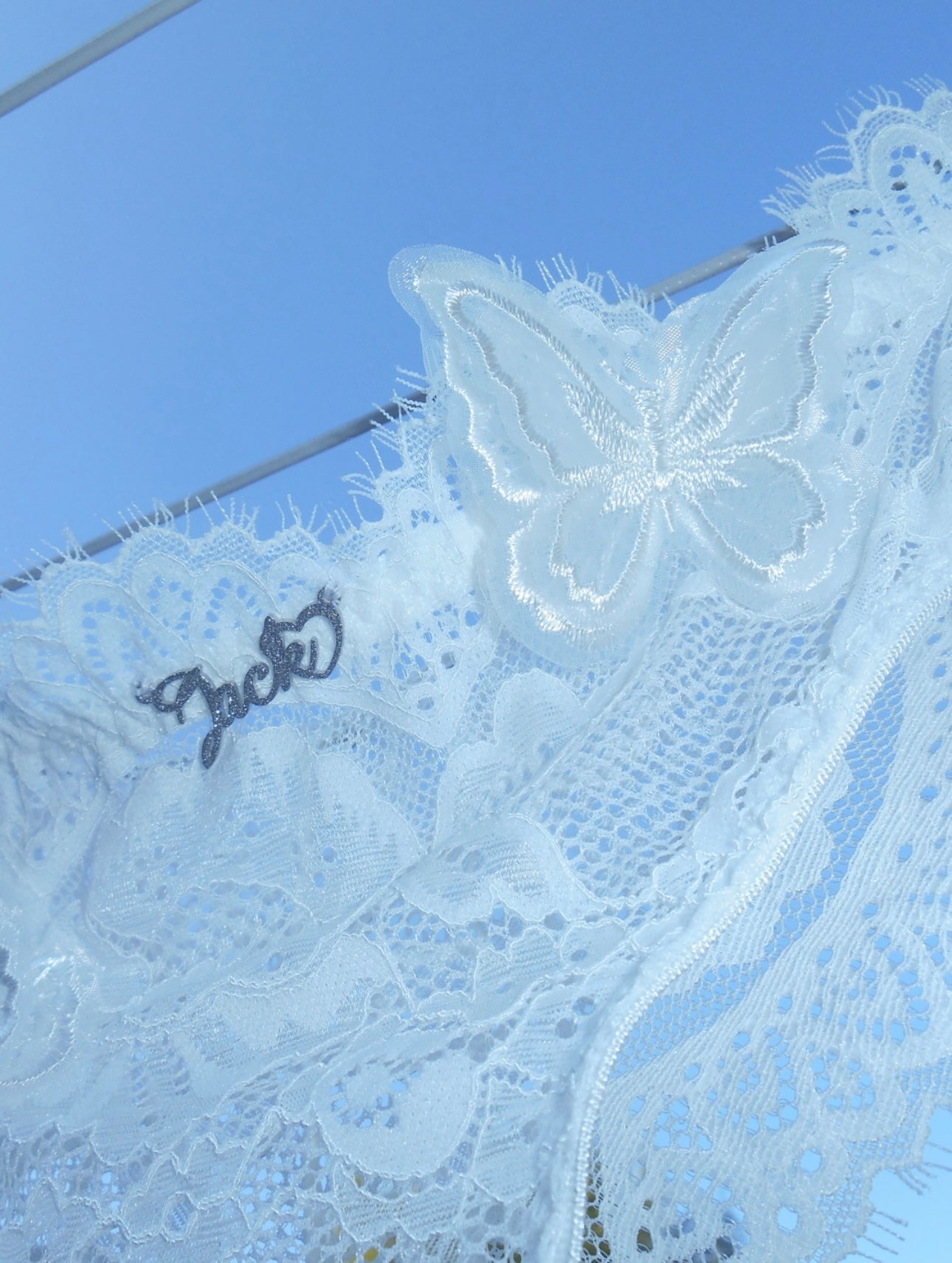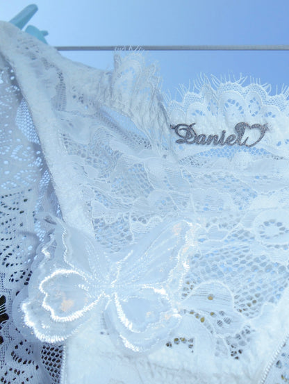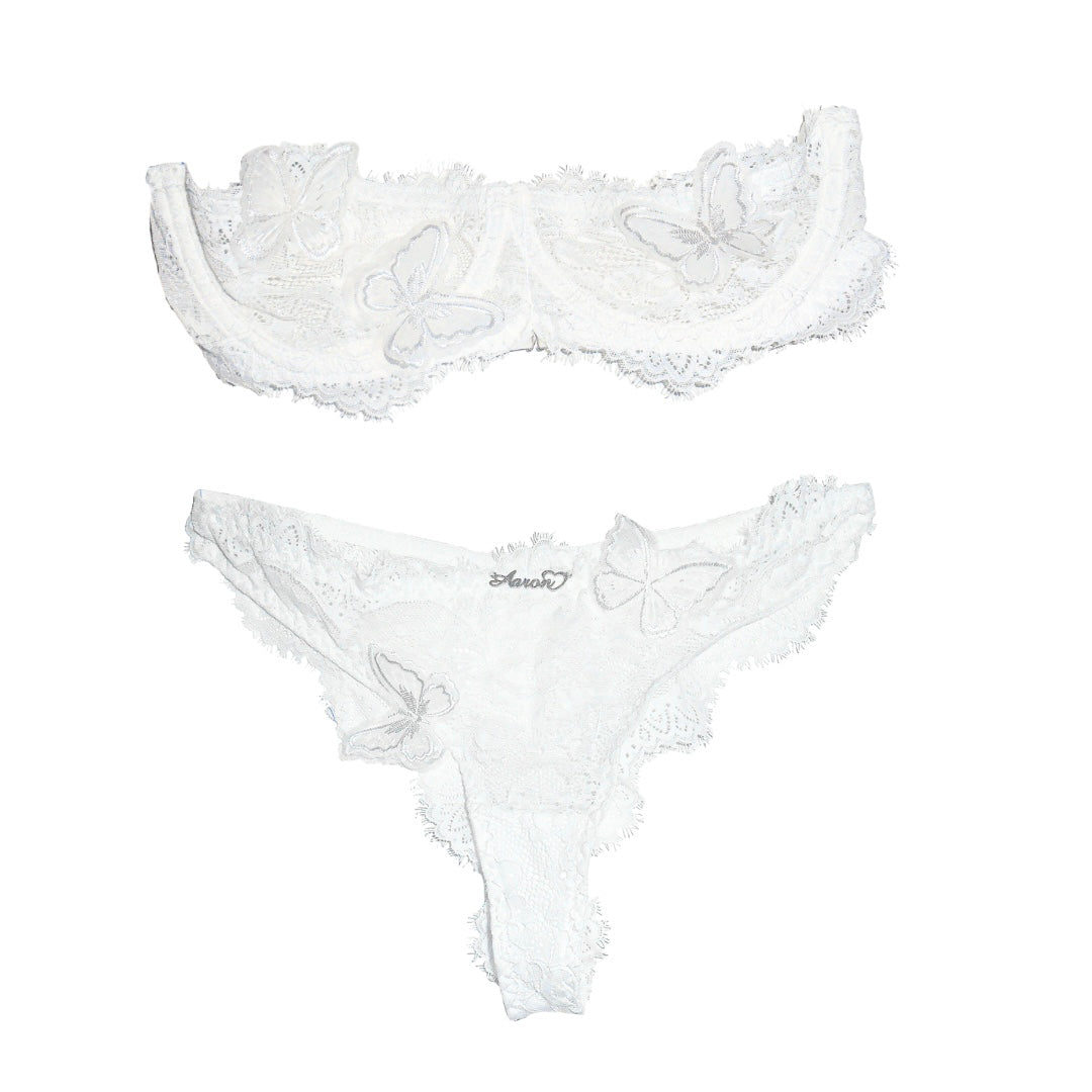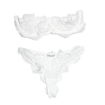 This set is more than just lingerie; it is the personification of true love and pure romance. Crafted from the finest white lace, the set is made up of an elegant strapless bra paired with flirtatious cheeky bottoms, designed to sculpt a soft, feminine silhouette that echoes the allure of a bridal gown. The set is adorned with delicate 3D butterflies delicately woven onto the fabric, adding the most enchanting touch of fantasy that makes that special someone's heart skip a beat.